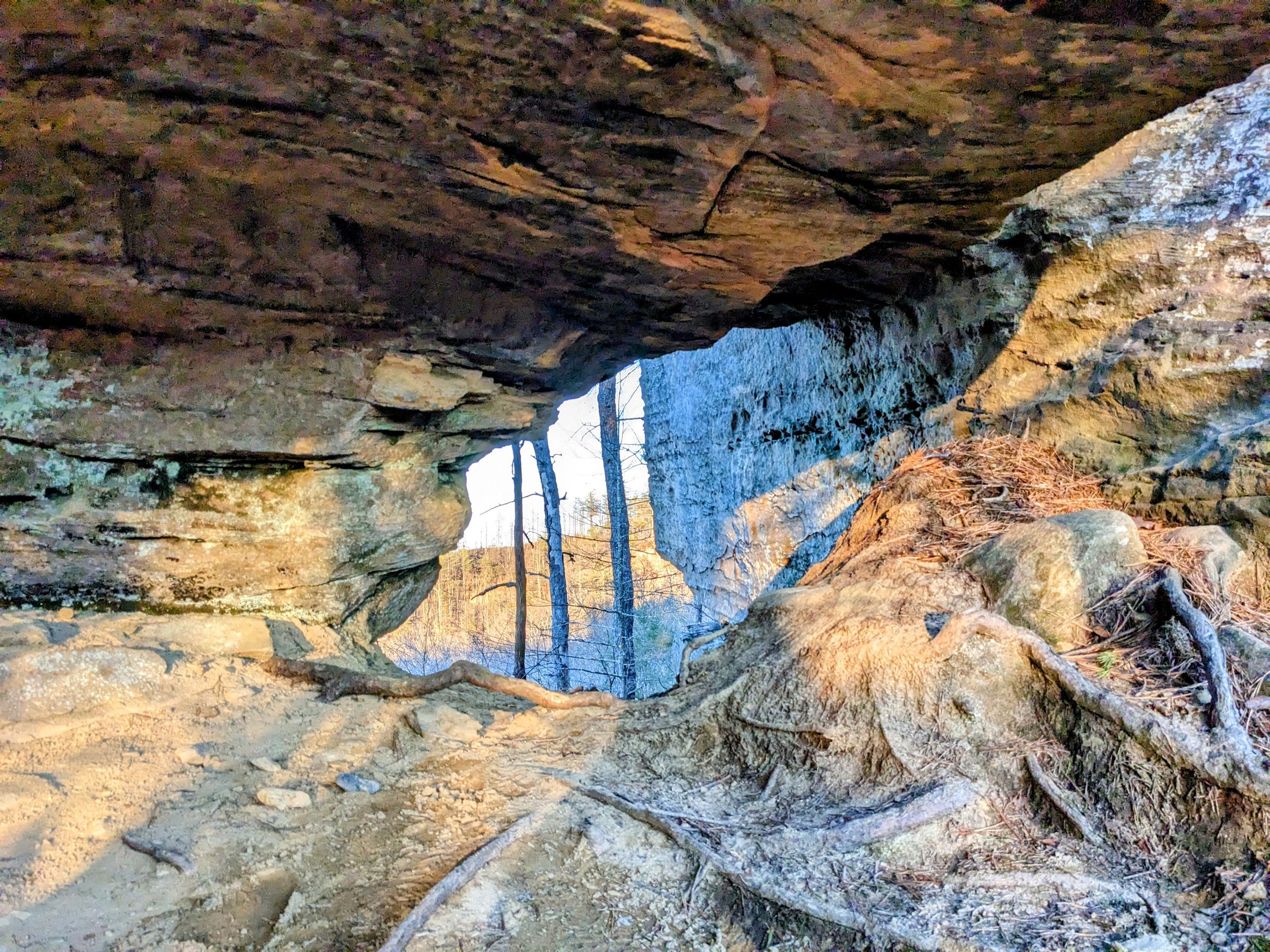 Trail Navigation. Locate the unmarked trailhead at the far end of the parking lot you entered. Take the first well defined fork to the right (north) and follow the user trail north-northeast until reaching the fire recovery area where the trail is quickly obscured by overgrowth and deadfall. Route finding here is relatively easy, but time consuming. Navigate until reaching the top of the ridge where the surrounding landscape comes into view. Follow the ridge out to the end from here in a north-northwesterly direction. An exposed rock away from the cliff’s edge is available and a nice sit spot. To reach Buzzards Roost North, locate the cliff’s edge by finding the line of exposed rock and following it to its northern end to a defining piece of rock that is the north roost. Retrace your steps out of the fire recovery zone and back uphill to reach Buzzards Roost Central a short descent from the main trail on your right (west). Return to the main trail and go back south-southwest until the trail begins to descend steeply toward Buzzards Roost South. Follow the finger of the ridge to the top of Keystone Arch where you will need to execute a class 3/4 scramble down the south side of the arch (north side is death). The best technique here is to wedge your body sideways using counter pressure and available holds in the rock until scooting your way to the bottom. A fall here can result in serious injury or death, so be sure with your hands and feet. Skip this if you’re not comfortable, decent views are available without this scramble. Once you’ve finished the scramble, explore the rock shelter to the south or continue west to reach Buzzards Roost North. There is a hole just off the trail that looked sketch AF near the rock shelter, so take care not to tumble here. After you’ve taken in the sights, retrace your steps and take the first wide path on your right to return to the parking lot.