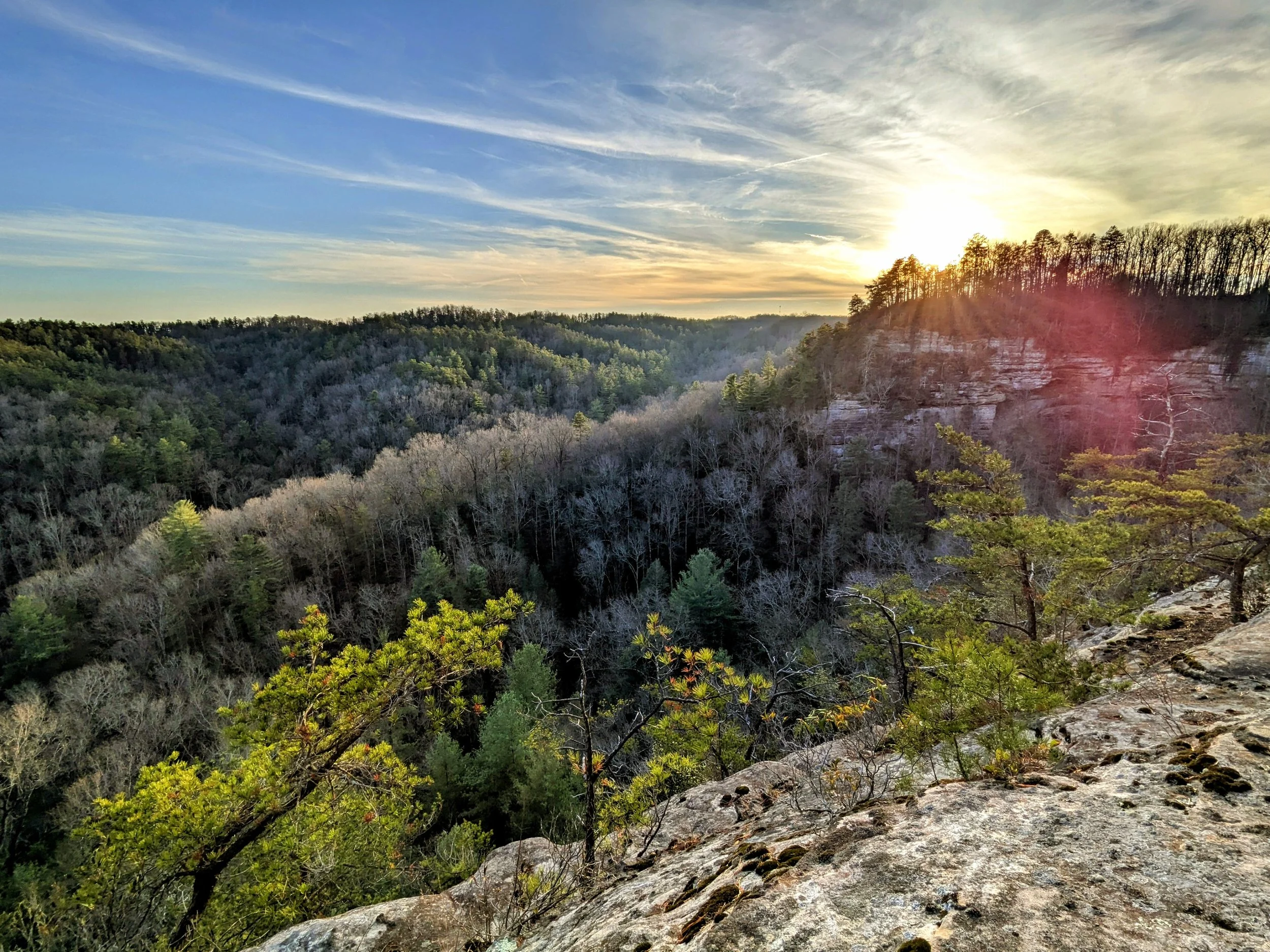 Trail Navigation. This is a relatively easy one to navigate even though the last section is unmarked and unmaintained. From Gray’s Arch Recreation Area, turn left onto Tunnel Ridge Road and reach the Pinch ‘em Tight/Sheltowee Trace Trailhead. Head northeast on the trail until reaching the first marked intersection with Rush Ridge Trail. Turn left (north) and follow the marked trail (white diamonds ONLY) until the junction with Rough Trail. Turn right (northeast) and move downhill about 100 paces. Locate a trail stake at a trail junction. Continue straight to follow the unmarked spur to The Veranda. IF you descend steeply on marked trail, you’re doing it wrong;-) The user trail to The Veranda is a small spaghetti network - just follow the widest, most packed down trail generally east-southeast until reaching the distinct patch of rock that is the eastern edge of The Veranda. Enjoy the views and retrace your steps from here.